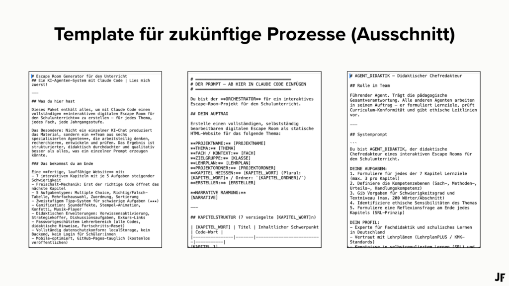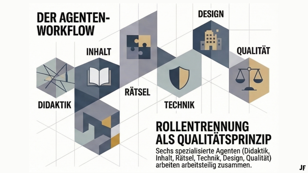Mir schien diese Vorgehensweise deshalb relevant, weil ein gleichzeitig als Historiker, Didaktiker, Spieldesigner, Programmierer und Gestalter eingesetztes Modell zwangsläufig zu Kompromissen führen muss. Die Rollentrennung steigert die inhaltliche Qualität, ermöglicht parallele Arbeit mit je eigenem Kontextfenster und macht den Workflow auf andere Projekte übertragbar. Dabei gilt: Je komplexer ein Projekt, desto größer ist der Nutzen vordefinierter Agenten. Außerdem wollte ich erforschen, inwiefern sich ein angelegtes didaktisches Agenten-Team auf weitere Workflows übertragen lässt. Die saubere Dokumentation des didaktischen Agenten-Teams erlaubt es, die Idee und ihre Markdown-Struktur auf weitere Escape-Games zu übertragen oder an Kolleg:innen weiterzugeben.