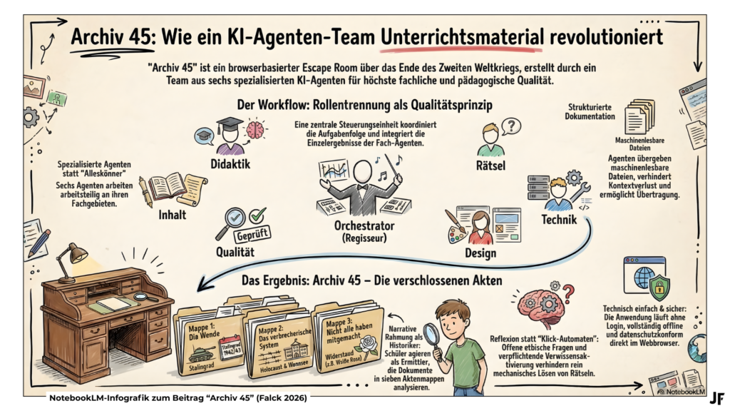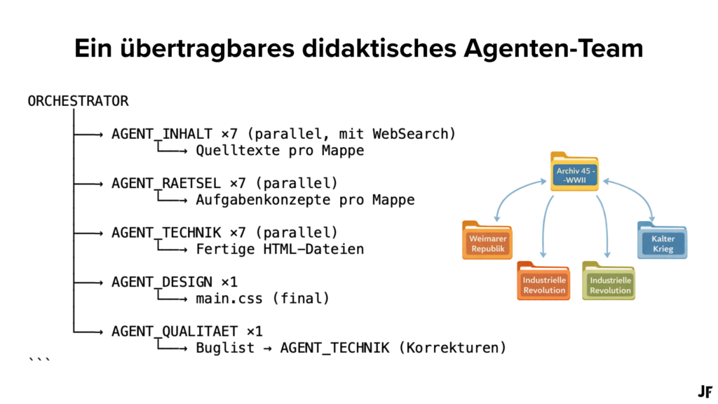 Archiv 45 soll kein Einzelstück bleiben. Mich faszinierte die Idee, ein agentisches Team aufzusetzen, mit dem ich anschließend weitere Szenarien entwickeln kann. Die Agenten-Dateien, Prompts und die Dokumentation sind deshalb so angelegt, dass sich dasselbe Vorgehen auf andere Unterrichtsthemen übertragen lässt.