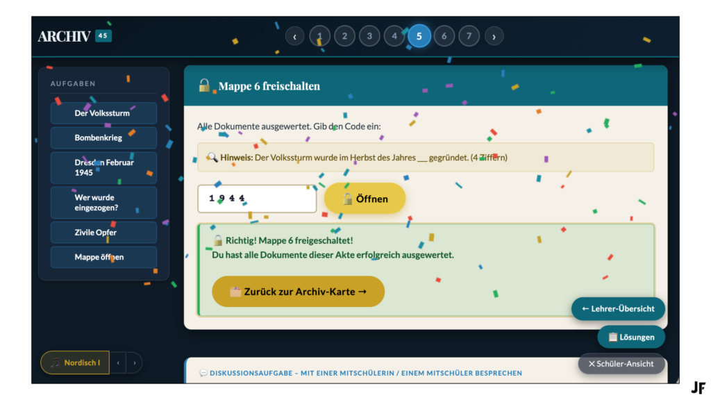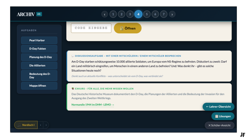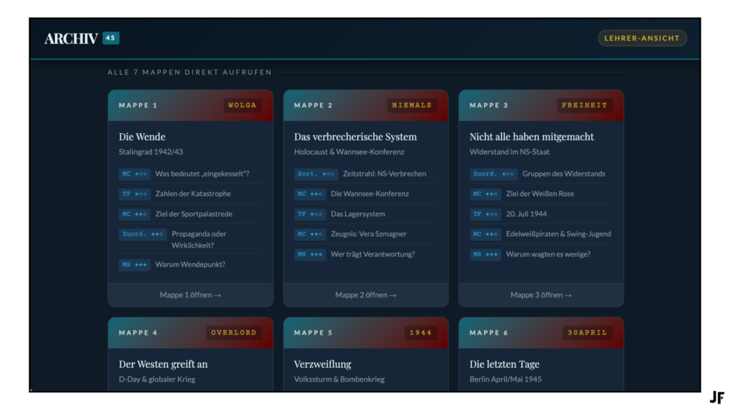 Aufbauend auf den Erfahrungen mit interaktiven Lernmaterialien (vgl. diesen Beitrag) wollte ich mit diesem didaktischen Agenten-Team eine anspruchsvolle und komplexe Lernumgebung als interaktive Website entwickeln. Was dabei entstanden ist, hat den Namen „Archiv 45 – Die verschlossenen Akten“ bekommen: Es handelt sich um ein vollständiges, browserbasiertes Escape-Game für den Geschichtsunterricht der achten Klasse.