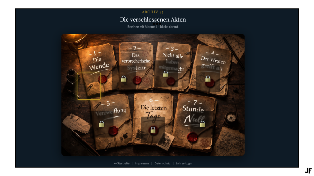 Das konzeptionelle Herzstück ist die narrative Rahmung. Im Jahr 2026 wurde in einem Berliner Kellergewölbe ein versiegeltes Archiv entdeckt. Es enthält sieben Mappen aus dem Jahr 1945, gefüllt mit Dokumenten, Karten, Berichten und persönlichen Aufzeichnungen aus den letzten Kriegsjahren. Jede Mappe ist mit einem Code gesichert. Die Schüler:innen schlüpfen in die Rolle historischer Ermittlerinnen und Ermittler, die Dokumente auswerten, Rätsel lösen und Codes erschließen, um die Geschichte des Kriegsendes Schritt für Schritt zu rekonstruieren.