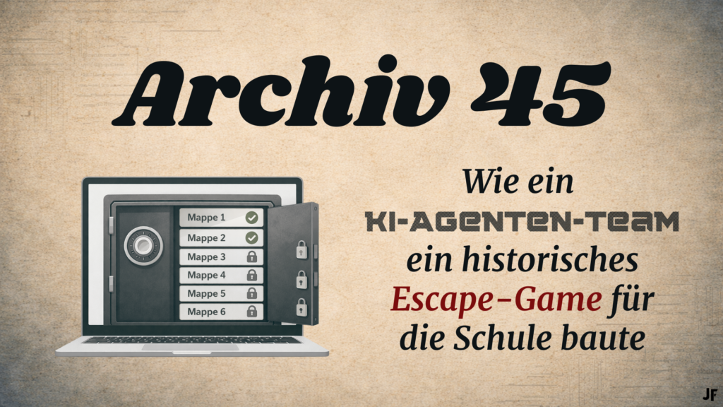 Schlussendlich werde ich Archiv 45 zusammen mit meinen Schüler:innen im Unterricht erproben, kritisch reflektieren und anschließend weiter verbessern (einige Testpersonen gab es auch schon). Parallel dazu werde ich mein didaktisches Agenten-Team weiter verfeinern und die Übertragbarkeit auf andere Fächer und Inhalte erproben. Mit etwas Routine dürften so weitere neue Lernszenarien entstehen, die dank der agentischen Struktur und der Dokumentation des ersten Projekts effektiv umgesetzt werden können.