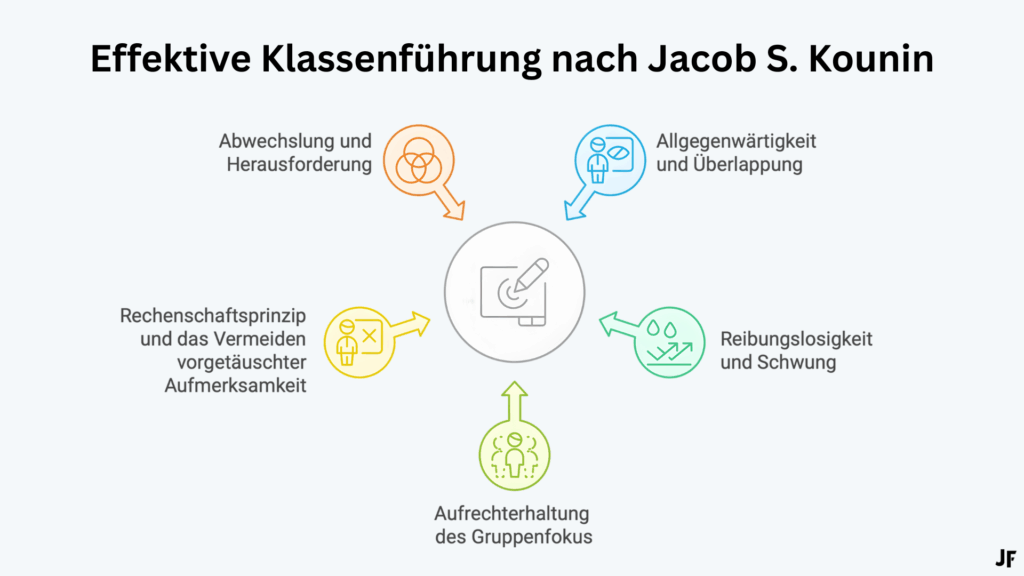 Kounin arbeitete in seinen Ausführungen mehrere Prinzipien erfolgreicher Klassenführung heraus, die sich im Rahmen seiner untersuchten Beispiele als zielführend (= Störungen sollen seltener auftreten) erwiesen haben. Sie stellen übergeordnete Kategorien des Lehrer:innenhandelns dar und sind nicht mit Interventionsstrategien bei störenden Verhaltensweisen zu verwechseln (obwohl Kounin anfangs nach derartigen Disziplinierungsmaßnahmen suchte) (vgl. Kounin 2006).