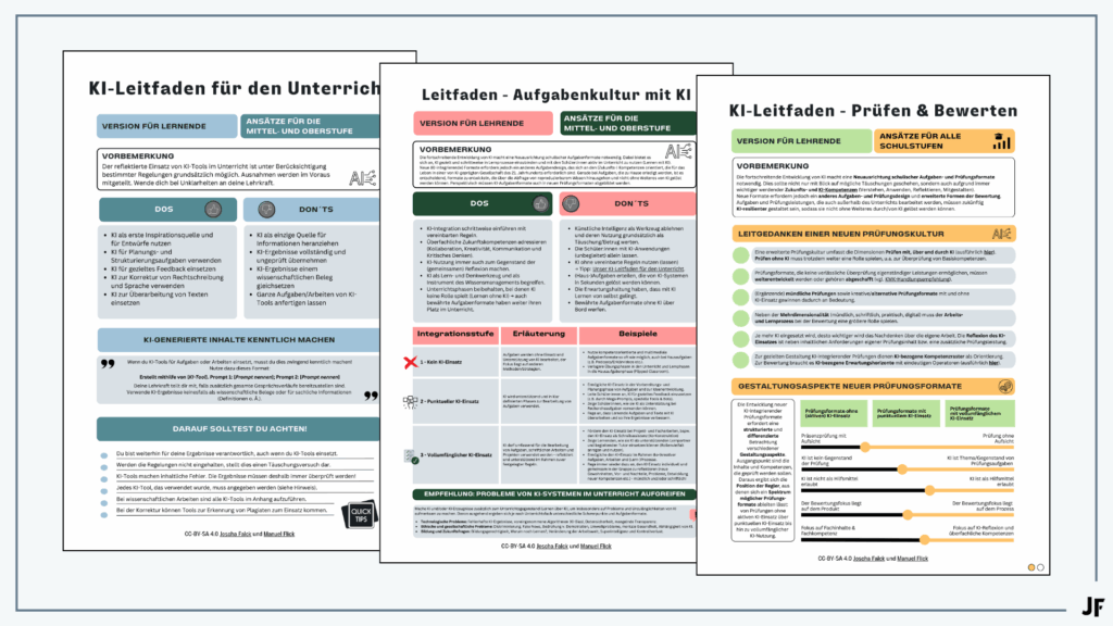 Insofern erfordert Classroom-Management im Umgang mit KI denselben Dreiklang aus didaktischen Ansätzen, bewusster Regulierung (technisch, pädagogisch) und intensiver Beziehungs- und Kommunikationsarbeit. Anregungen für eine differenzierte Integration von KI-Anwendungen im Unterricht finden sich zum Beispiel in den von Manuel Flick und mir entwickelten Praxis-Leitfäden (Teil I – allgemein, Teil II – Aufgabenkultur, Teil III – Prüfen & Bewerten). Wer mit seinen Schüler:innen KI-Regeln fürs Klassenzimmer vereinbaren will, kann den ersten Teil unseres Leitfadens nutzen, auf eine Poster-Vorlage von Jennifer Stier zurückgreifen (das THINK-Prinzip) und/oder diese Vorlage verwenden.