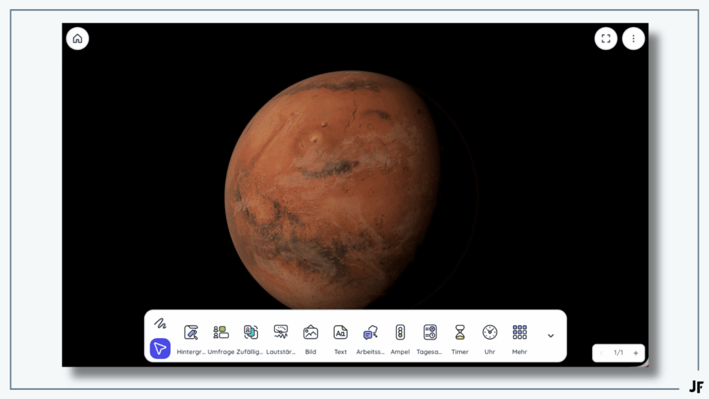 Für Visualisierungen, Timer-Anzeigen und Unterrichtssymbole für verschiedene Sozialformen kann z. B. die browserbasierte Anwendung Classroomscreen verwendet werden. Mit ihr kann eine digitale und konfigurierbare Oberfläche mit verschiedenen nützlichen Symbolen bestückt werden. In der kostenfreien Variante können die Screens jedoch nicht gespeichert werden. Um die volle Funktionalität nutzen zu können, sind ein Benutzer:innenkonto sowie der Abschluss eines Abos erforderlich.