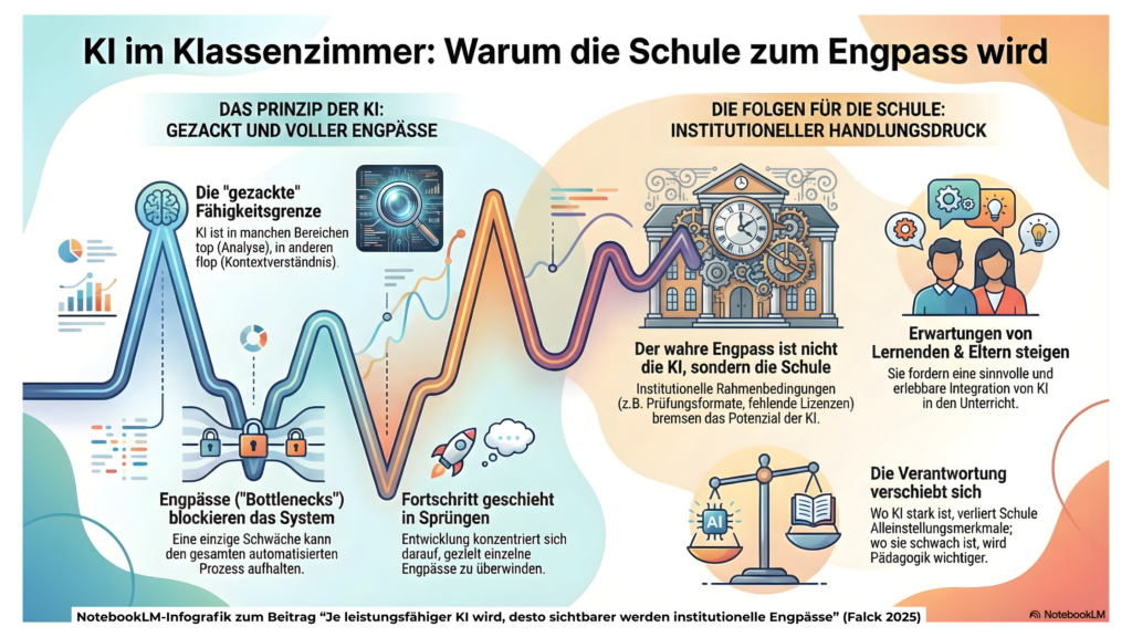 Meine These zum Start in das neue Jahr lautet: Je leistungsfähiger KI wird, desto sichtbarer werden diese institutionellen Engpässe. Es ist daher davon auszugehen, dass wir den daraus resultierenden Veränderungs- und Handlungsdruck im Jahr 2026 noch stärker spüren werden. Die gezackte Fähigkeitsgrenze mit ihren Engpässen ist kein KI-Makel, auf dem sich die Schule mit ihren institutionellen Routinen ausruhen kann. Im Gegenteil führen die bereits bestehenden Fähigkeiten von KI und die hinzukommenden Veränderungen an den Engpässen dazu, dass sich die Verantwortung noch mehr verschiebt. Dort, wo KI stark ist, verliert Schule weiter an Alleinstellungsmerkmalen. Dort, wo KI schwach bleibt, gewinnen pädagogische Professionalität, Haltung und Urteilskraft an Bedeutung.