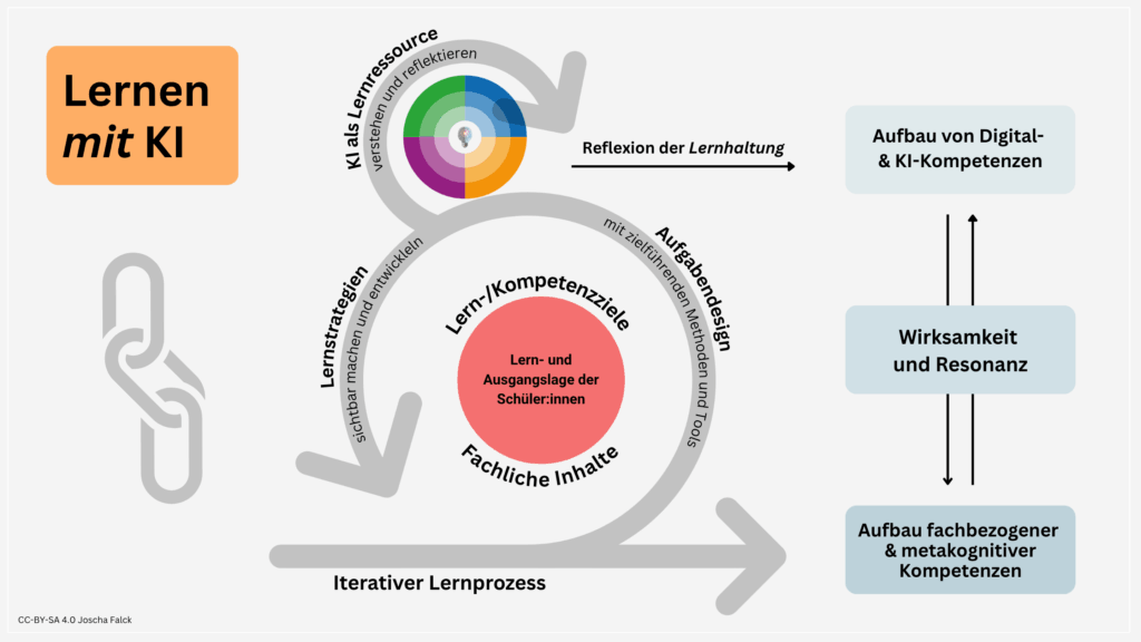 Meine Überlegungen habe ich als Reflexionsfolie für Lehrkräfte, Schulen und Veranstaltungen in einer Grafik zusammengefasst, die an unser KI-Kompetenzmodell (vgl. hier) anschließt und das Lernen mit KI (vgl. hier) systematisiert und als iterativen Prozess konkretisiert.