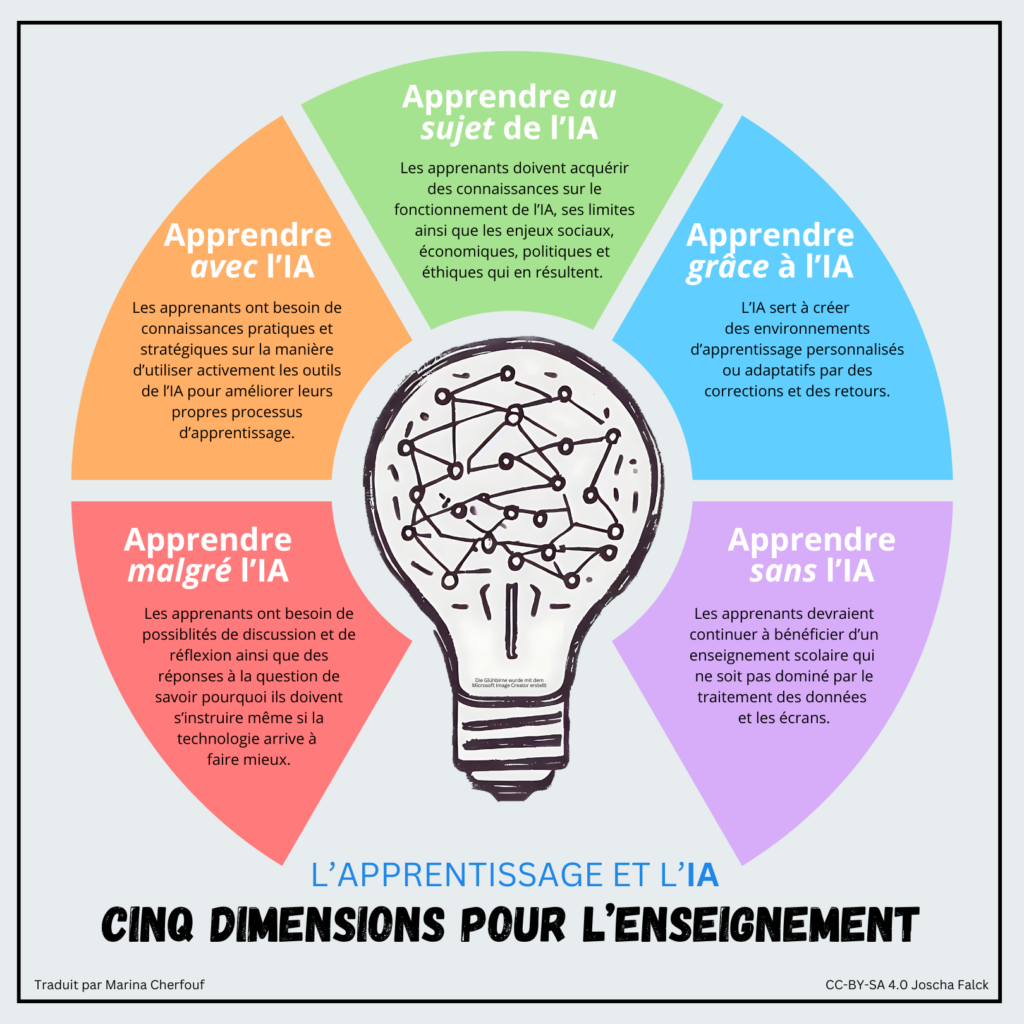 Lernen und KI – fünf Dimensionen für den Unterricht in einer englischen, einer spanischen und einer französischen Version